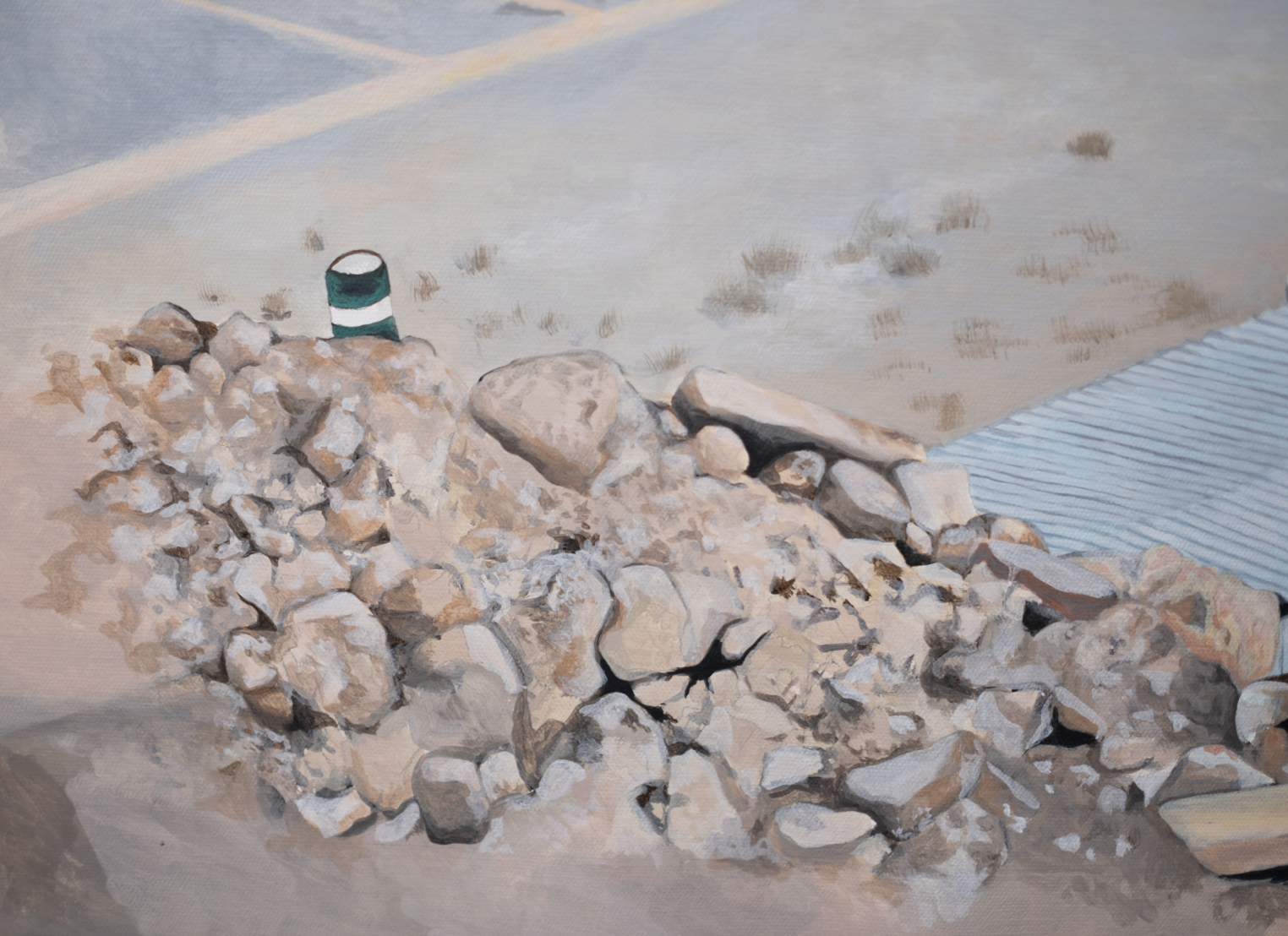 This painting came from a moment when things finally clicked. I was driving to my friend’s house in a rapidly developing area of Riyadh, where construction fences are everywhere. Through a small opening in one, I caught a glimpse of a massive hole in the ground. I turned back to take a closer look. There were signs that read “Luxury Palace for Sale” and “Demolition Contractors.”
