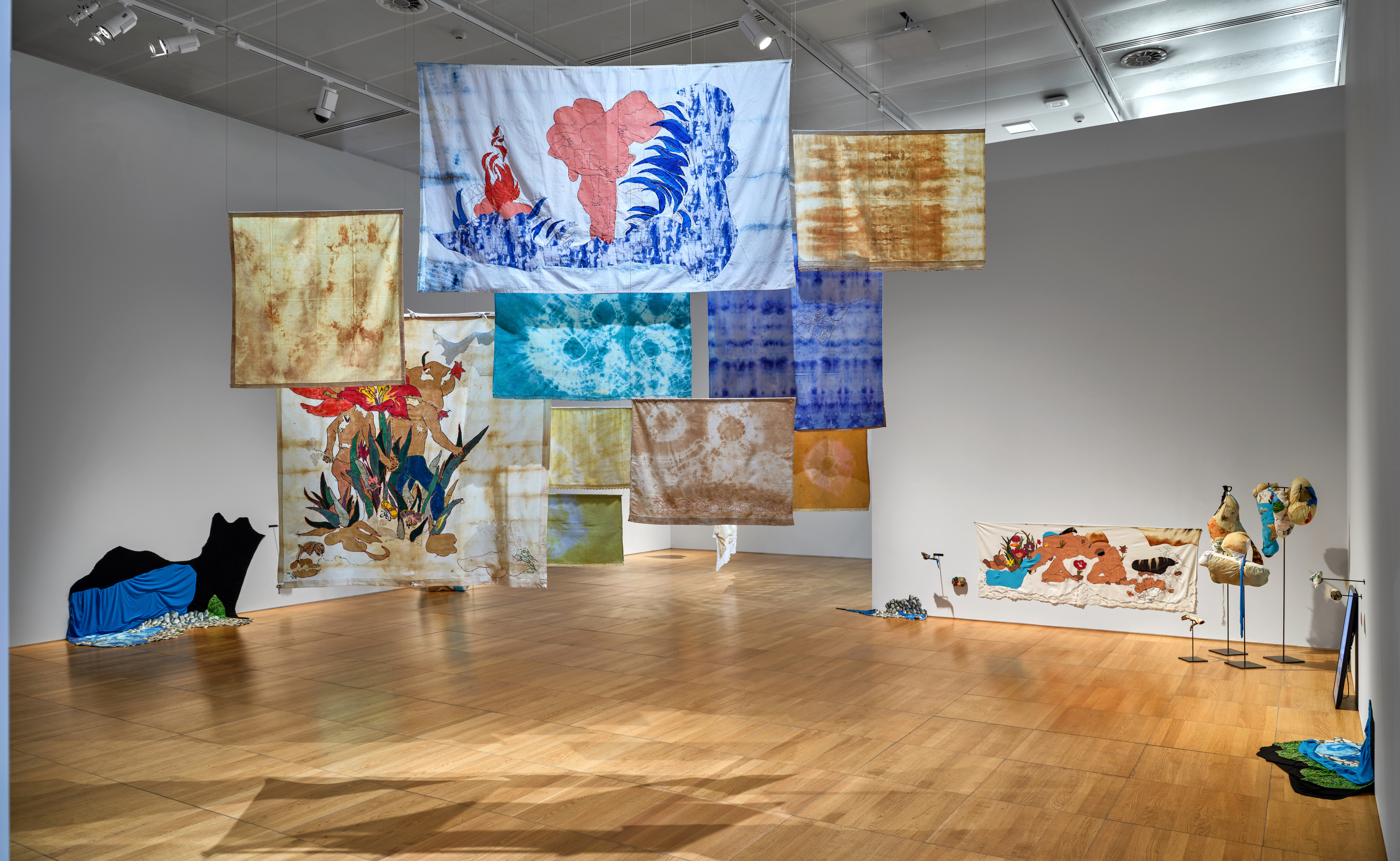 3. Installation view: Gözde İlkin, Entrusted Ground, 2022-ongoing. Dyed and stitched fabrics, fiber filling, stones, twigs, video, 3-channel sound, performance, dimensions variable. Photo: John Varghese