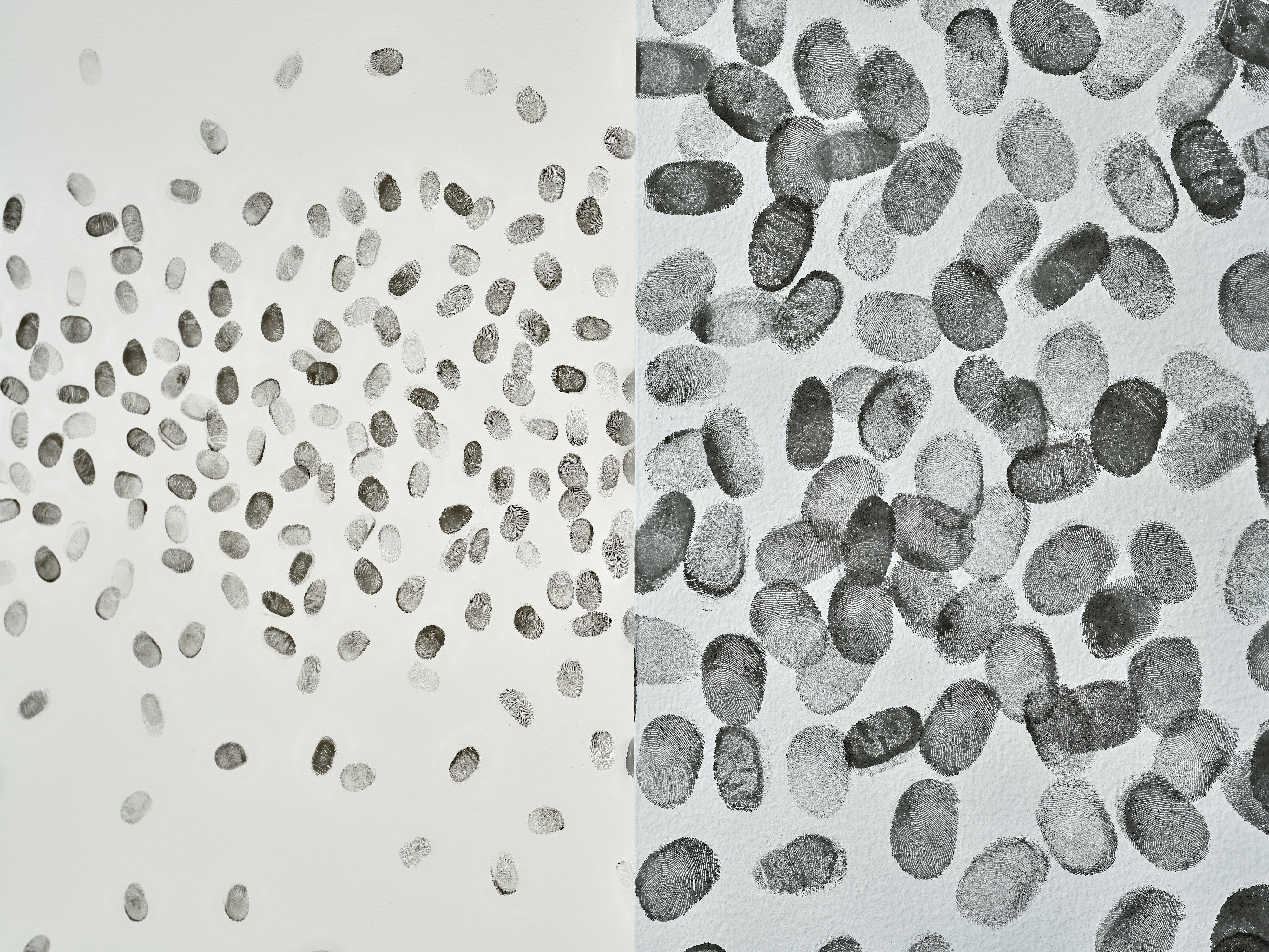 The presence of others’ bodies is made palpable even before I set foot in the gallery. My walk towards the entrance is accompanied by a wall dotted with hundreds of black thumbprints. It is Rana Begum’s No. 1348 Wall Drawing (2024), inspired by the artist’s experience of providing her thumbprint to authorize the passing of her father’s property following his death in her home country of Bangladesh. The marks hint at the many hands that were at work to create the piece—an aspect echoed in Sol LeWitt’s Wall Drawing 797 (2024) facing the entrance of the gallery. Half-completed at the time of my visit, its vivid colors imbue the space with a playful energy, which contrasts with the poignant context behind Begum’s work.