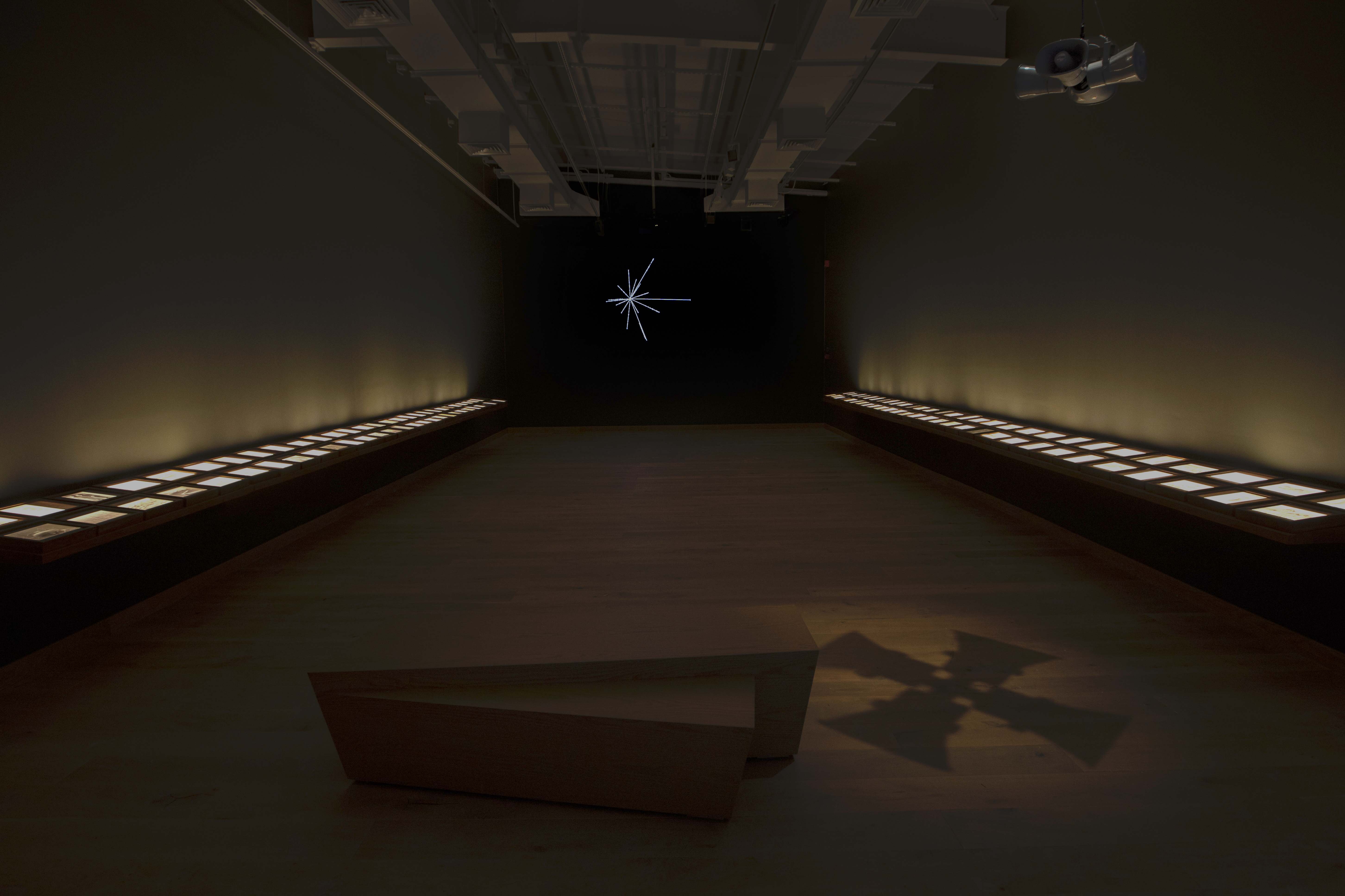 4. Jitish Kallat, Installation view of Covering Letter (terranum nuncius) (2018-2021) at Ishara Art Foundation. 116 stereoscopic parallax prints on Plexiglas, programmed LED panels, frames, wooden shelves and bench, 4-horn speakers, video projection, Dimensions variable. Image courtesy of the artist and Ishara Art Foundation. Photo by Ismail Noor/Seeing Things.
