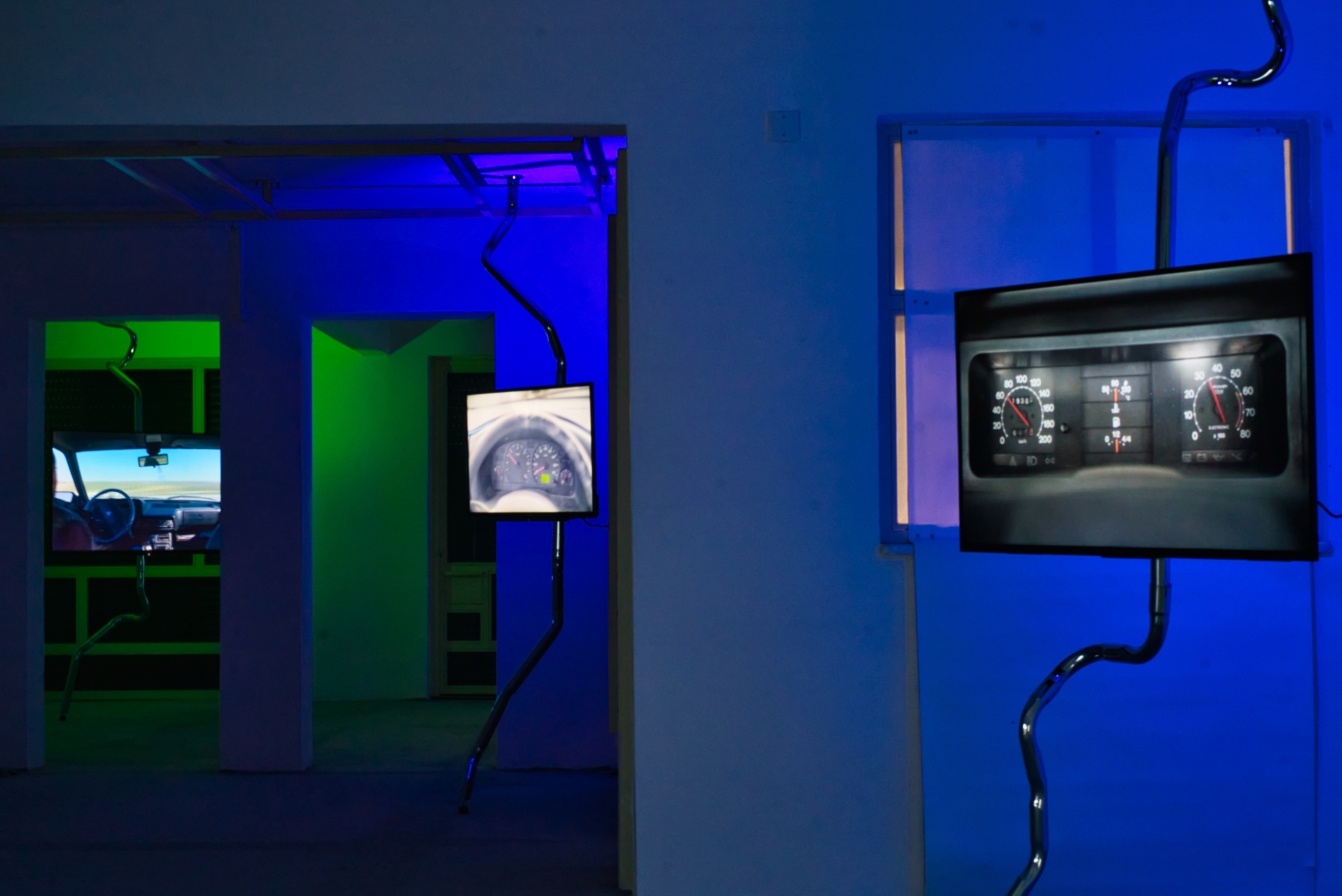 It turned out that Sarp Özer, the system operator of AVTO, was standing across the street. He guided me to the space, which was tucked away in the basement of the building right next to Emek Apartment. As I stood before the door, I could hear an undulating electric hum, which grew louder upon entering the space. The walls were bathed in green, blue, and violet lights, which emanated from behind the screens that were scattered across the space. Each screen flashed a dashboard, the interior and exterior of a car engaged in circular motion, and a tow truck carrying away a car. Artist Burak Kabadayı's exhibition, Static Shifts, Dynamic Rifts, was on view. After introducing the exhibition and answering some questions about it, Sarp kindly agreed to speak about AVTO with me at a later time.