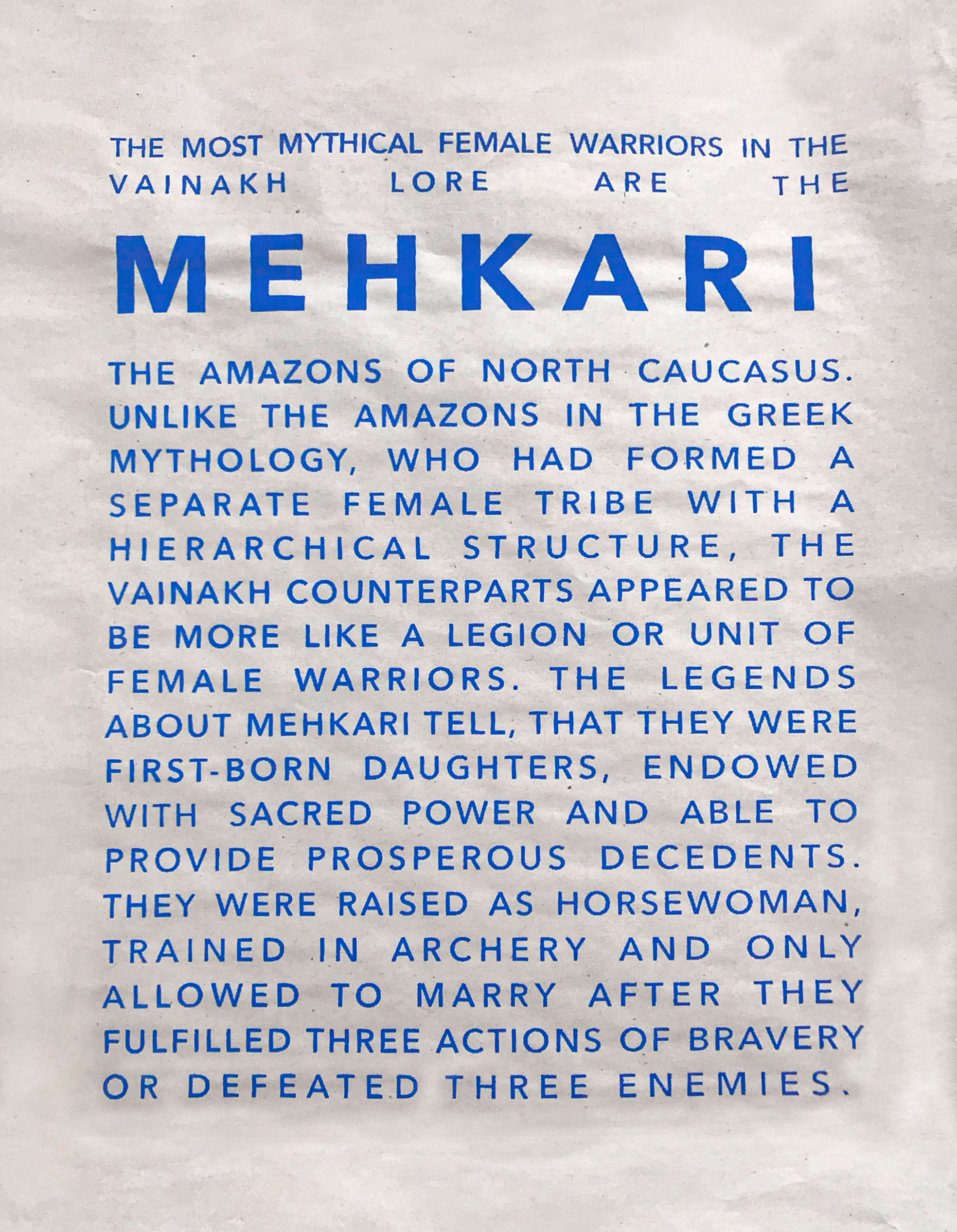 “Chechen are fighters. But there is a reason we’re seen as fighters.” Anita set the tone at the exhibition’s Zoom artist talk hosted by MIA Anywhere. “The artists are Mehkari because they choose to acknowledge and honor the trauma and the strength of their predecessors. They are not that different in spirit, to those lionhearted warriors: our great-great-great-grandmothers that reigned in the mountains of the Caucasus.”