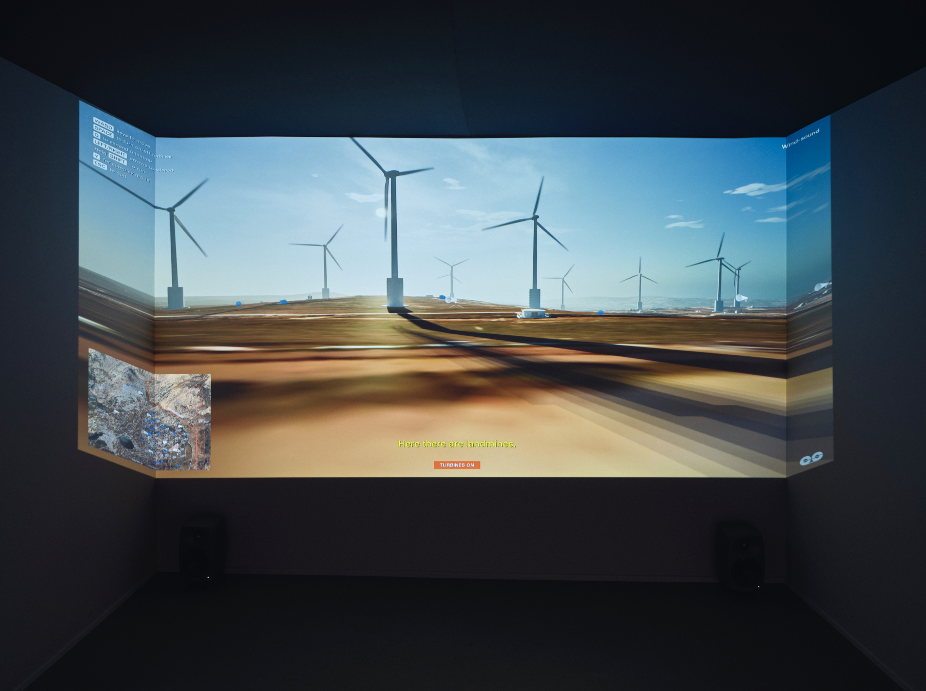 Mona Hatoum’s Plotting Table (1998) shows modern global military actions in minimalist aesthetics, while Crude Eye (2022) by Monira Al Qadiri associates petroleum operation systems with an imaginary metropolis. Farah Al Qasimi depicts lives surrounding the perfume production and merchandising in the UAE in her Dream Soup (2019), whereas Lawrence Abu Hamdan’s video game simulation, Zifzafa (2024), reveals the violent action of noise pollution by wind turbines in Syrian Jawlan Heights. However, more than narratives, the artworks in the exhibition proved the dynamic scope of engagements with technologies.