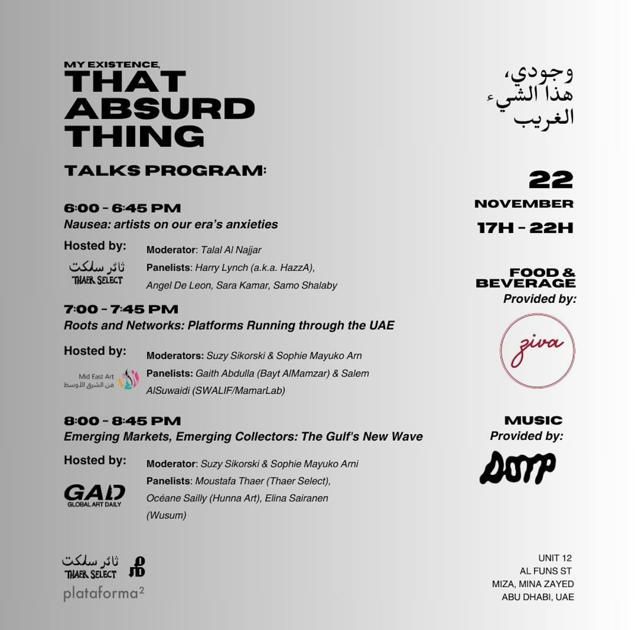 Opening to the public tomorrow in the district of MiZa, Abu Dhabi: a must-see group exhibition, “My Existence, That Absurd Thing” curated by Talal Al Najjar hosted at MamarLab organized by Thaer Select produced by plataforma2.