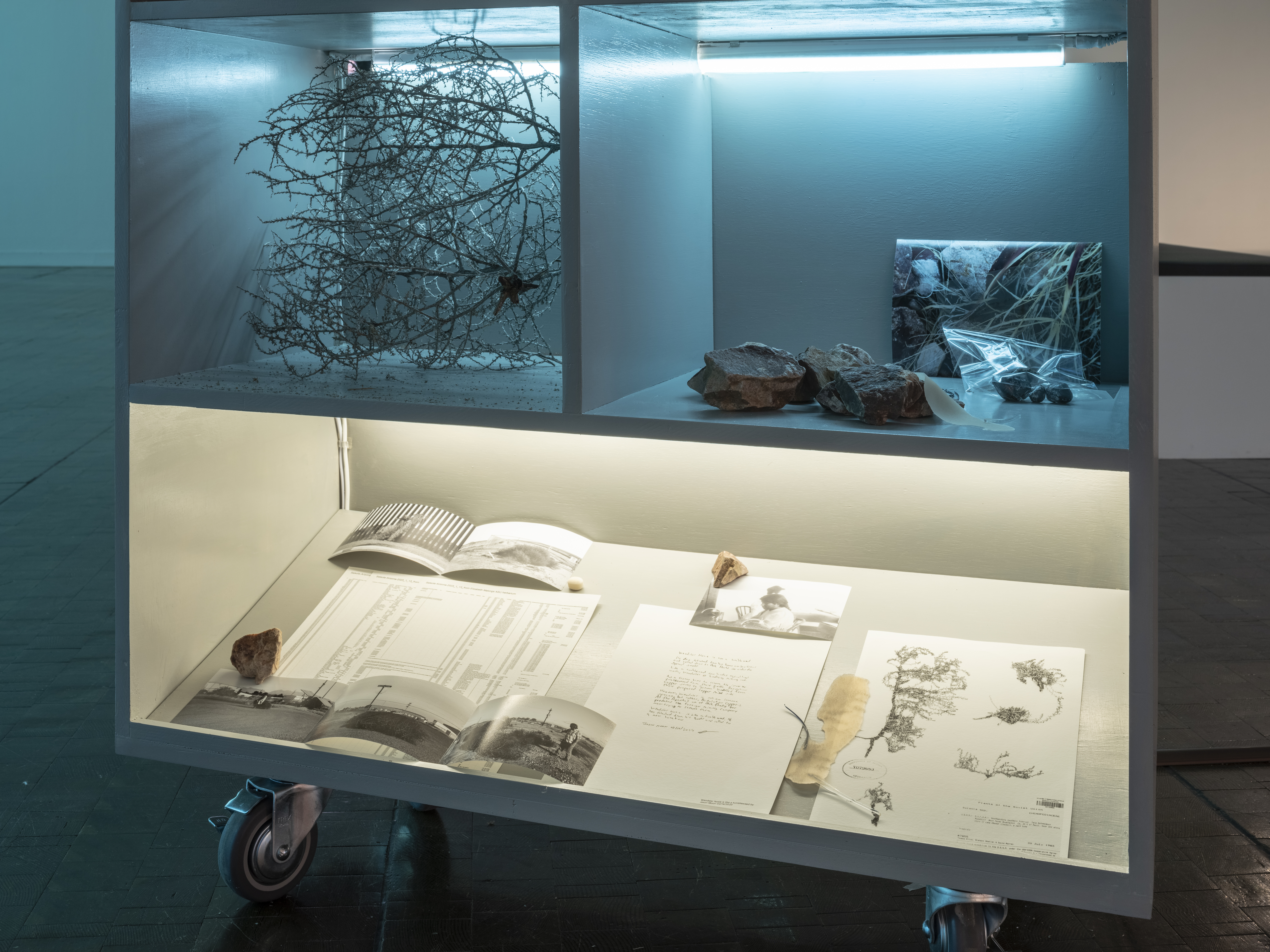 C.S.C.: I wanted to create a laboratory-like feeling. Color is used to tell whether a tumbleweed is alive or not, as it turns from green to brown or gray throughout its life. In the case of tumbleweeds bearing seeds in their bodies, I wanted to give them a unified color so that the viewer wouldn’t be able to distinguish the state they’re in. As I’m not exactly exploring the plant itself in my work, I wanted them to look like something else.