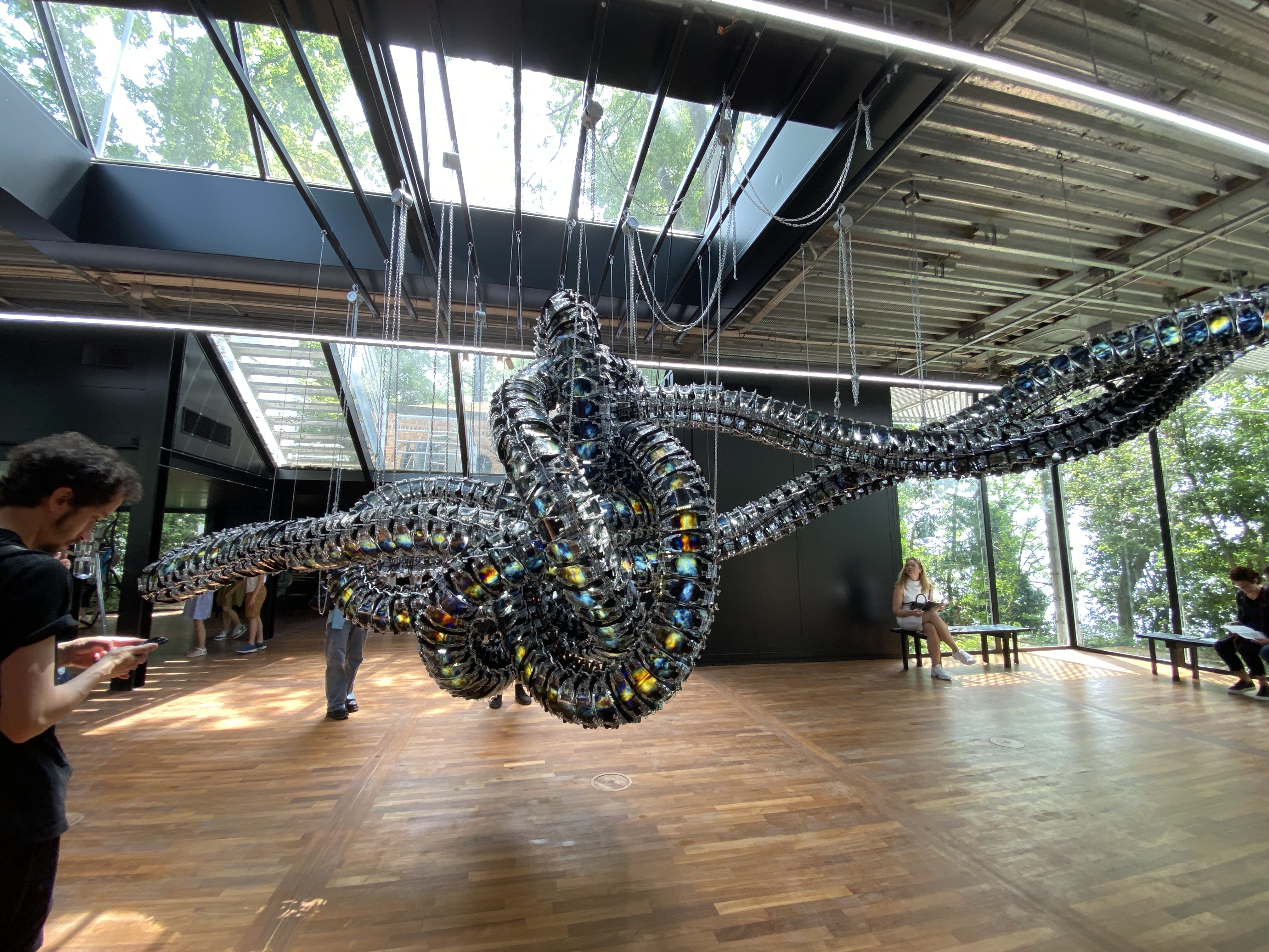 As the latest addition to the Giardini’s permanent national pavilions, the Korean Pavilion, established in 1995, is relatively small in size. For this year’s Biennale, however, transdisciplinary artist and electronic music composer Yunchul Kim created a system that defies the Pavilion’s spatial boundaries, opening up an interconnected world that kindles awe and imagination. Though the exhibition title, Gyre, is intended as a “metaphor for the current swirling state of confusion the world is in as we wait for change to come,” the experience of the show is far from unsettling. As I traversed the naturally-lit space inhabited by bizarre yet spectacular structures, I was filled with wonder. The centerpiece, Chroma V (2022), hangs from the ceiling and is an imposing fifty-meter-long structure coiled into a knot. The colors of the opalescent cells swell and subside as the cells pulsate at irregular intervals. This movement is caused by another installation in the exhibition: Argos – The Swollen Suns (2022). Similarly impressive in its scale and technological feat, Argos detects muons –cosmic nanoparticles created when colliding with the Earth’s atmosphere– and sends signals to other installations in the exhibition to trigger their movements. Looking at Argos, it becomes clear how the pavilion has been conceived as a “sprawling body”; the works, like organs in a body, are connected with one another and the surrounding environment, as they receive and react to signals as small as muons and as big as the ocean (Impulse (2018), one of the installations, circulates seawater from Venice). At a time when technology is being discussed as a powerful collaborator in creating enhanced systems or as a threat to humanity, it was refreshing to see machines freed from such responsibilities and fears to just exist as beings, in tune with the “natural” environment. It is the beauty and poetry of such redefining of the relationship between the human, non-human, machine, and material happening in Gyre that made it stand out amongst the many impressive exhibitions at the Giardini.