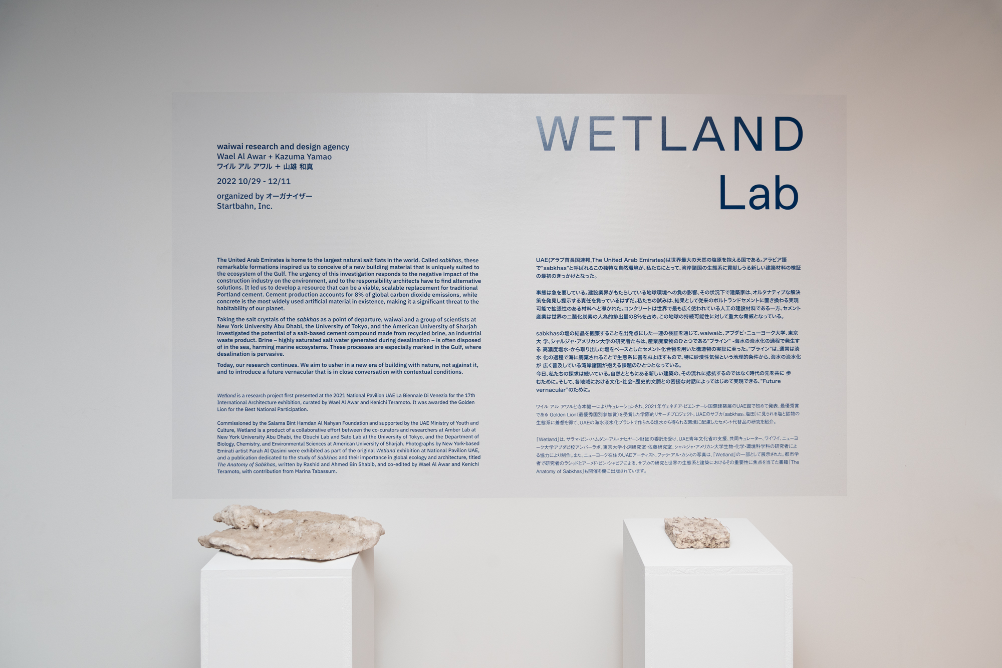 Until December 11th, 2022, waiwai research and design agency is exhibiting their Wetland Lab research project at SRR Project Space, an exhibition space operated by Japanese art tech company Startbahn in the heart of Shimokitazawa, Tokyo. Wetland is a project led by waiwai research and design agency, the research arm of waiwai, an award-winning architectural practice with offices in Dubai and Tokyo. The research project proposes an environmentally friendly salt-based cement alternative inspired by sabkhas—crystalline salt formations found in wetlands in the United Arab Emirates. This is Wetland’s first presentation in Japan, a year after it premiered at the National Pavilion of the UAE for the 17th International Architecture Exhibition at the Venice Biennale.