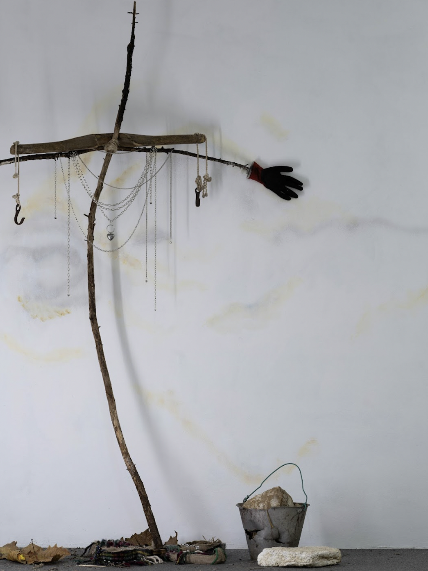Instead of placing destruction and construction in a dichotomous relationship, Hvass merges the two qualities in an intricate equilibrium that sustains a cyclical return of hope, and this is where The Cleaner (2023) enters the scene. The cleaner, created with two wooden sticks and an assortment of silvery found objects, is a caricature of a scarecrow. The heart-shaped keychain, chains, and plastic flowers –cheap and tacky trinkets that trigger a pang in the chest– are evocative of childhood friendship bracelets. Despite its cartoonish facade and feeble-looking structure, this anthropomorphized assemblage exudes an air of otherworldly piety dramatized by the directional spotlighting. The yoke on its stretched arms implicates the weight of the physical and emotional labor modern-day society carries on its shoulders. The sculpture stands as a witty and performative iconography of Hvass’s yearning for how things could be; it is an act of extending their hands in raging love and care. When everything has fallen to the ground, space for alternative forms of life and collectivity may be imagined and realized.